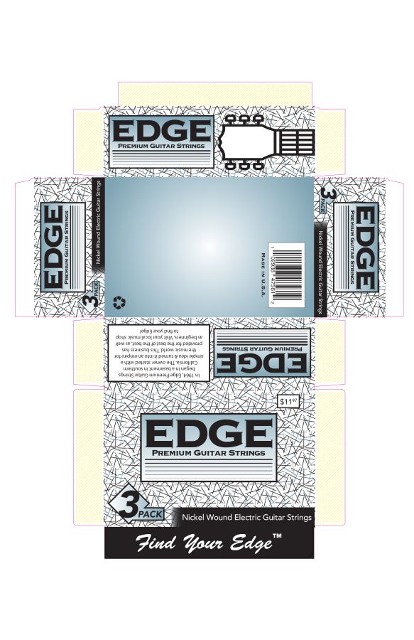 My concept for this packaging design was to create a sleek look for a folding guitar strings box. I wanted an interesting patterned background with heavy, rich black to break it up. The dynamic shapes and typography I chose really makes it stand out.